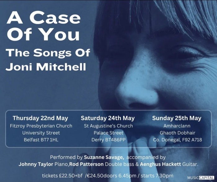 I am excited to be going on tour this week in Northern Ireland! Performing the wonderful songs of Joni Mitchell in Belfast, Derry amd Gweedore, Co. Donegal with Suzanne Savage, Johnny Taylor and Rod Patterson. Tickets and more info. here